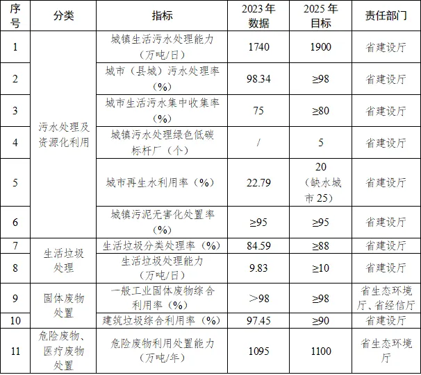 污水處理及資源化利用。到2025年,全省城鎮(zhèn)生活污水處理能力達(dá)到1900萬噸/日,全省城市(縣城)污水處理率達(dá)到98%以上,城市生活污水集中收集率力爭達(dá)到80%以上;進(jìn)水五日生化需氧量(BOD5)濃度高于100毫克/升的城市污水處理廠規(guī)模占比達(dá)到90%以上或較2022年提高5個百分點(diǎn);打造5個以上城鎮(zhèn)污水處理綠色低碳標(biāo)桿廠;全面完成接入城鎮(zhèn)污水處理廠的市政污水管網(wǎng)和工業(yè)園區(qū)集中污水處理設(shè)施的配套污水管網(wǎng)(均含提升泵站等附屬設(shè)施)隱患排查工作,有序推進(jìn)問題管網(wǎng)提升改造任務(wù);全省各城市再生水利用率不低于20%,其中缺水城市不低于25%。城鎮(zhèn)污泥無害化處置率不低于95%。