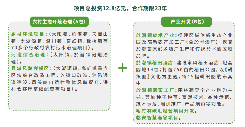 該項目范圍為臨安區(qū)錢塘江流域、苕溪流域面源污染治理和產(chǎn)業(yè)開發(fā),包括144個行政村農(nóng)村生活污水治理及“污水零直排區(qū)”提質(zhì)增效,及河道水生態(tài)環(huán)境綜合整治項目,包括河道水質(zhì)提升改善、截污納 管、水生態(tài)和水環(huán)境綜合治理、對河道的受污染水體進行污染物消減和生態(tài)自凈功能恢復(fù),去除水體中的COD、氨磷等污染物,村落風(fēng)貌景觀樣板區(qū)打造,於潛酒廠,鄉(xiāng)村稻田文旅配套設(shè)施,蔬菜工廠,毛竹林 經(jīng)營碳匯等。