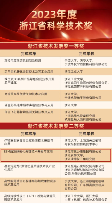 浙江商達(dá)公用集團(tuán)聯(lián)合浙江農(nóng)林大學(xué)、浙江清華長(zhǎng)三角研究院合作研發(fā)的“EEM菌發(fā)酵強(qiáng)化關(guān)鍵技術(shù)開發(fā)與應(yīng)用”榮獲浙江省技術(shù)發(fā)明獎(jiǎng)二等獎(jiǎng)。