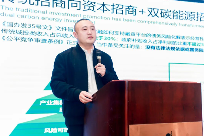 中能國新環(huán)??萍几笨偨?jīng)理、零碳事業(yè)部總經(jīng)理中能國新環(huán)??萍几笨偨?jīng)理、零碳事業(yè)部總經(jīng)理劉帥作題為《零碳示范園區(qū)投規(guī)建運一體化·共筑綠色未來》的主旨報告,報告簡述了零碳產(chǎn)業(yè)的政策背景及產(chǎn)業(yè)現(xiàn)狀,并通過招商模式轉(zhuǎn)型、產(chǎn)業(yè)鏈協(xié)同發(fā)展、多元運營等發(fā)面,詳細介紹了零碳產(chǎn)業(yè)園區(qū)的運營方案。最后,指出打造零碳示范園有賦能地方產(chǎn)業(yè)綠色高質(zhì)量發(fā)展,助力地方GDP長期穩(wěn)定增加的生態(tài)、經(jīng)濟意義。