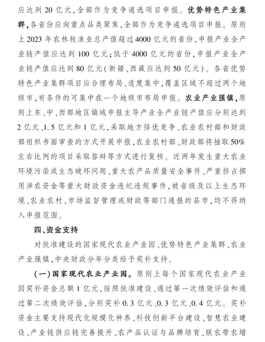 1.國(guó)家現(xiàn)代農(nóng)業(yè)產(chǎn)業(yè)園全部作為競(jìng)爭(zhēng)遴選項(xiàng)目申報(bào),優(yōu)勢(shì)特色產(chǎn)業(yè)集群全部作為競(jìng)爭(zhēng)遴選項(xiàng)目申報(bào),農(nóng)業(yè)產(chǎn)業(yè)強(qiáng)鎮(zhèn)采取地方擇優(yōu)競(jìng)爭(zhēng)、農(nóng)業(yè)農(nóng)村部和財(cái)政部組織書面審查的方式開展申報(bào)。