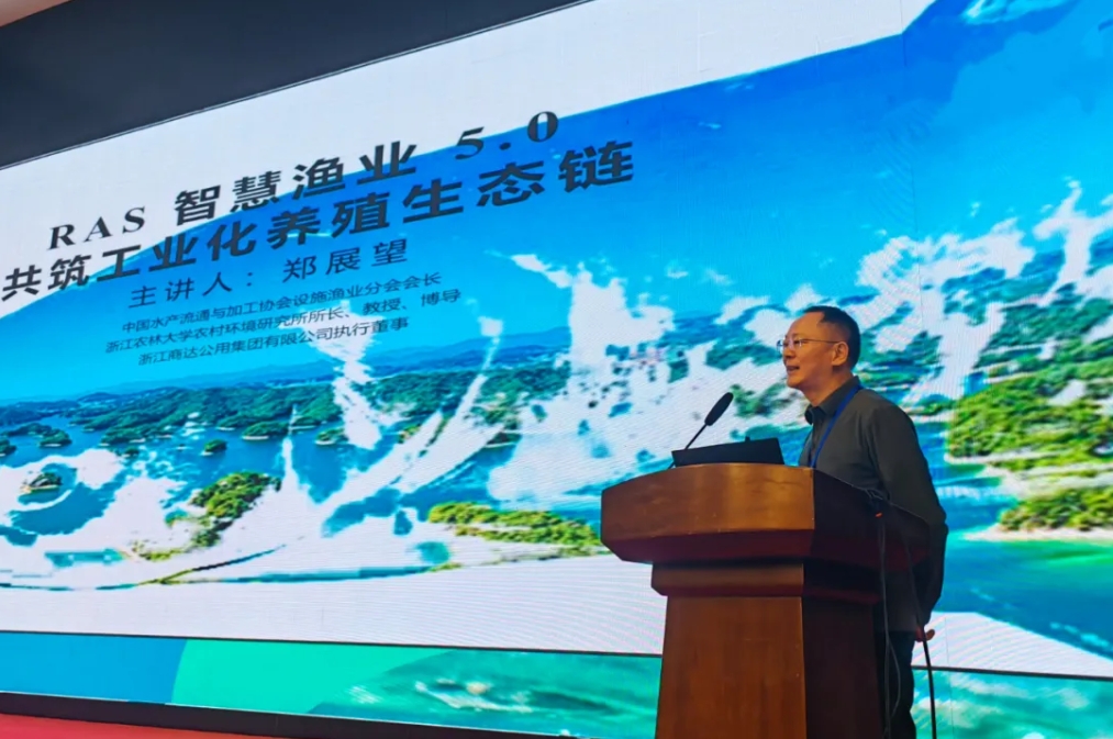 中國(guó)水產(chǎn)流通與加工協(xié)會(huì)設(shè)施漁業(yè)分會(huì)會(huì)長(zhǎng)、浙江商達(dá)公用集團(tuán)有限公司執(zhí)行董事鄭展望教授受邀出席,作為主講嘉賓分享了《RAS智慧漁業(yè)5.0:共筑工業(yè)化養(yǎng)殖生態(tài)鏈》的創(chuàng)新實(shí)踐成果,為全球水產(chǎn)養(yǎng)殖轉(zhuǎn)型升級(jí)提供商達(dá)公用方案。