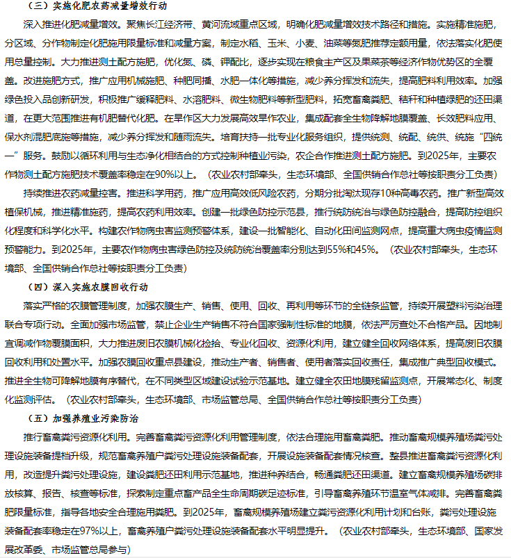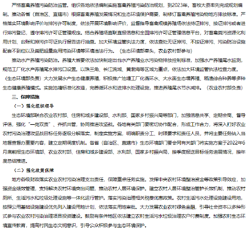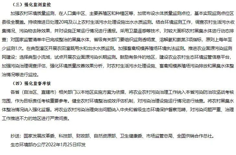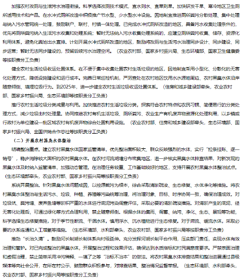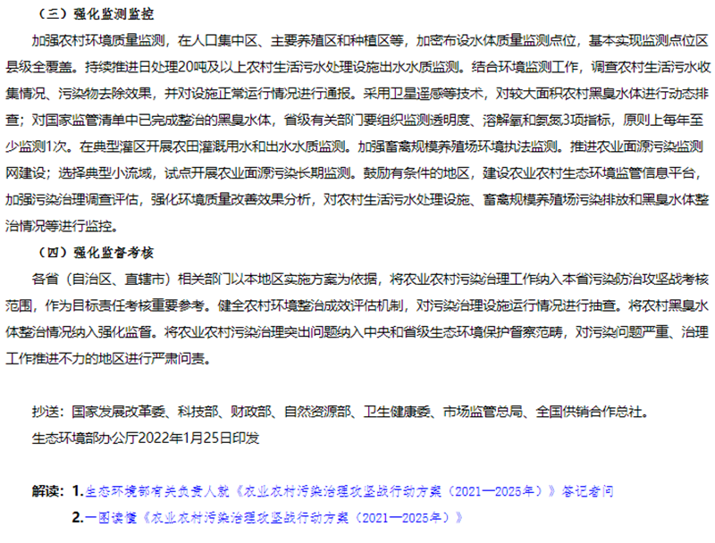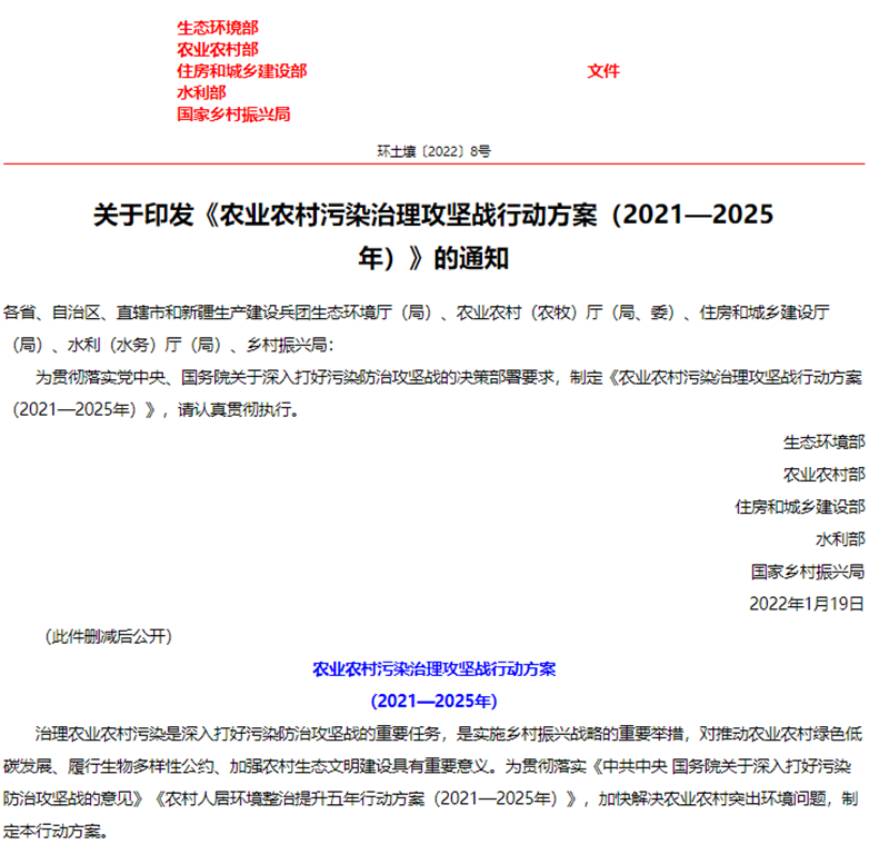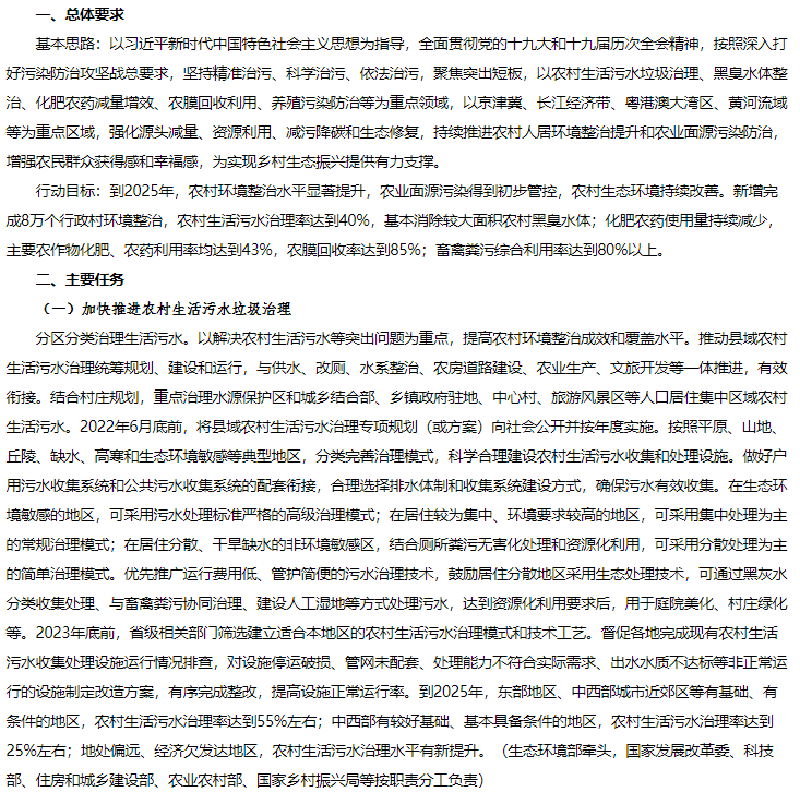 1月25日,生態(tài)環(huán)境部、農(nóng)業(yè)農(nóng)村部、住房和城鄉(xiāng)建設(shè)部、水利部、國家鄉(xiāng)村振興局聯(lián)合發(fā)布《農(nóng)業(yè)農(nóng)村污染治理攻堅(jiān)戰(zhàn)行動方案(2021—2025年)》的通知。方案指出到2025年,農(nóng)村環(huán)境整治水平顯著提升,農(nóng)業(yè)面源污染得到初步管控,農(nóng)村生態(tài)環(huán)境持續(xù)改善。新增完成8萬個行政村環(huán)境整治,農(nóng)村生活污水治理率達(dá)到40%,基本消除較大面積農(nóng)村黑臭水體;化肥農(nóng)藥使用量持續(xù)減少,主要農(nóng)作物化肥、農(nóng)藥利用率均達(dá)到43%,農(nóng)膜回收率達(dá)到85%;畜禽糞污綜合利用率達(dá)到80%以上。《方案》指出在2021年至2025年農(nóng)業(yè)農(nóng)村污染治理攻堅(jiān)具有以下任務(wù):(一)加快推進(jìn)農(nóng)村生活污水垃圾治理分區(qū)分類治理生活污水。以解決農(nóng)村生活污水等突出問題為重點(diǎn),提高農(nóng)村環(huán)境整治成效和覆蓋水平。推動縣域農(nóng)村生活污水治理統(tǒng)籌規(guī)劃、建設(shè)和運(yùn)行,與供水、改廁、水系整治、農(nóng)房道路建設(shè)、農(nóng)業(yè)生產(chǎn)、文旅開發(fā)等一體推進(jìn),有效銜接。結(jié)合村莊規(guī)劃,重點(diǎn)治理水源保護(hù)區(qū)和城鄉(xiāng)結(jié)合部、鄉(xiāng)鎮(zhèn)政府駐地、中心村、旅游風(fēng)景區(qū)等人口居住集中區(qū)域農(nóng)村生活污水。2022年6月底前,將縣域農(nóng)村生活污水治理專項(xiàng)規(guī)劃(或方案)向社會公開并按年度實(shí)施。按照平原、山地、丘陵、缺水、高寒和生態(tài)環(huán)境敏感等典型地區(qū),分類完善治理模式,科學(xué)合理建設(shè)農(nóng)村生活污水收集和處理設(shè)施。做好戶用污水收集系統(tǒng)和公共污水收集系統(tǒng)的配套銜接,合理選擇排水體制和收集系統(tǒng)建設(shè)方式,確保污水有效收集。在生態(tài)環(huán)境敏感的地區(qū),可采用污水處理標(biāo)準(zhǔn)嚴(yán)格的高級治理模式;在居住較為集中、環(huán)境要求較高的地區(qū),可采用集中處理為主的常規(guī)治理模式;在居住分散、干旱缺水的非環(huán)境敏感區(qū),結(jié)合廁所糞污無害化處理和資源化利用,可采用分散處理為主的簡單治理模式。優(yōu)先推廣運(yùn)行費(fèi)用低、管護(hù)簡便的污水治理技術(shù),鼓勵居住分散地區(qū)采用生態(tài)處理技術(shù),可通過黑灰水分類收集處理、與畜禽糞污協(xié)同治理、建設(shè)人工濕地等方式處理污水,達(dá)到資源化利用要求后,用于庭院美化、村莊綠化等。2023年底前,省級相關(guān)部門篩選建立適合本地區(qū)的農(nóng)村生活污水治理模式和技術(shù)工藝。督促各地完成現(xiàn)有農(nóng)村生活污水收集處理設(shè)施運(yùn)行情況排查,對設(shè)施停運(yùn)破損、管網(wǎng)未配套、處理能力不符合實(shí)際需求、出水水質(zhì)不達(dá)標(biāo)等非正常運(yùn)行的設(shè)施制定改造方案,有序完成整改,提高設(shè)施正常運(yùn)行率。到2025年,東部地區(qū)、中西部城市近郊區(qū)等有基礎(chǔ)、有條件的地區(qū),農(nóng)村生活污水治理率達(dá)到55%左右;中西部有較好基礎(chǔ)、基本具備條件的地區(qū),農(nóng)村生活污水治理率達(dá)到25%左右;地處偏遠(yuǎn)、經(jīng)濟(jì)欠發(fā)達(dá)地區(qū),農(nóng)村生活污水治理水平有新提升。(生態(tài)環(huán)境部牽頭,國家發(fā)展改革委、科技部、住房和城鄉(xiāng)建設(shè)部、農(nóng)業(yè)農(nóng)村部、國家鄉(xiāng)村振興局等按職責(zé)分工負(fù)責(zé))加強(qiáng)農(nóng)村改廁與生活污水治理銜接。科學(xué)選擇改廁技術(shù)模式,宜水則水、宜旱則旱。加快研發(fā)干旱、寒冷地區(qū)衛(wèi)生廁所適用技術(shù)和產(chǎn)品。在水沖式廁所改造中積極推廣節(jié)水型、少水型水沖設(shè)施。因地制宜推進(jìn)廁所糞污分散處理、集中處理與納入污水管網(wǎng)統(tǒng)一處理,鼓勵聯(lián)戶、聯(lián)村、村鎮(zhèn)一體處理。已完成水沖式廁所改造的地區(qū),具備污水收集處理?xiàng)l件的,優(yōu)先將廁所糞污納入生活污水收集和處理系統(tǒng);暫時(shí)無法納入污水收集處理系統(tǒng)的,應(yīng)建立廁所糞污收集、儲存、資源化利用體系,避免化糞池出水直排。計(jì)劃開展水沖式廁所改造的地區(qū),鼓勵將改廁與生活污水治理同步設(shè)計(jì)、同步建設(shè)、同步運(yùn)營;暫時(shí)無法同步建設(shè)的,預(yù)留后續(xù)污水治理空間。(農(nóng)業(yè)農(nóng)村部、國家鄉(xiāng)村振興局、生態(tài)環(huán)境部、國家衛(wèi)生健康委等按職責(zé)分工負(fù)責(zé))健全農(nóng)村生活垃圾收運(yùn)處置體系。在不便于集中收集處置農(nóng)村生活垃圾的地區(qū),因地制宜采用小型化、分散化的無害化處理方式,降低設(shè)施建設(shè)和運(yùn)行成本。完善日常巡檢機(jī)制,嚴(yán)厲查處在農(nóng)村地區(qū)飲用水水源地周邊、農(nóng)村黑臭水體沿岸隨意傾倒、填埋垃圾行為。到2025年,進(jìn)一步健全農(nóng)村生活垃圾收運(yùn)處置體系。(住房和城鄉(xiāng)建設(shè)部牽頭,農(nóng)業(yè)農(nóng)村部、國家鄉(xiāng)村振興局、生態(tài)環(huán)境部等按職責(zé)分工負(fù)責(