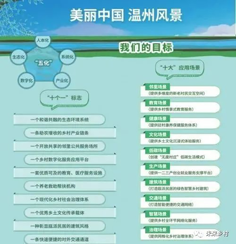 以“五化”為方向,"十個一”為標(biāo)志,聚焦“十大"應(yīng)用場景,2021年先行啟動25個未來鄉(xiāng)村試點,計劃到2025年全市創(chuàng)成100個以上未來鄉(xiāng)村,使未來鄉(xiāng)村真正成為美麗中國的溫州風(fēng)景。