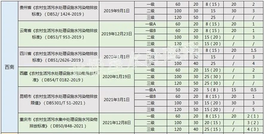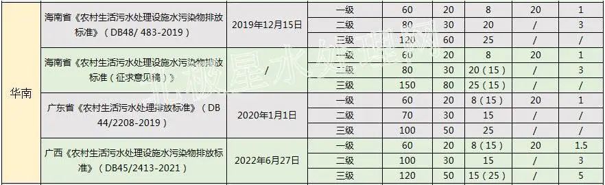 目前,全國(guó)31個(gè)省份以及昆明市均已制定了地方農(nóng)村生活污水處理設(shè)施水污染物排放標(biāo)準(zhǔn),并且有多個(gè)省份根據(jù)新要求進(jìn)行了修訂。如近日海南省公布了最新的海南省《農(nóng)村生活污水處理設(shè)施水污染物排放標(biāo)準(zhǔn)(征求意見(jiàn)稿)》,與DB48/ 483-2019相比,在主要指標(biāo)上有所放寬。