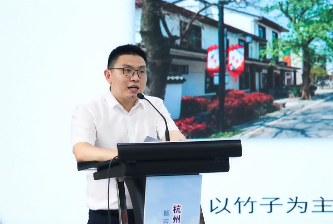 余杭區(qū)林水局領導,浙江農林大學環(huán)境研究院所所長鄭展望為百丈竹林經營碳匯項目揭牌