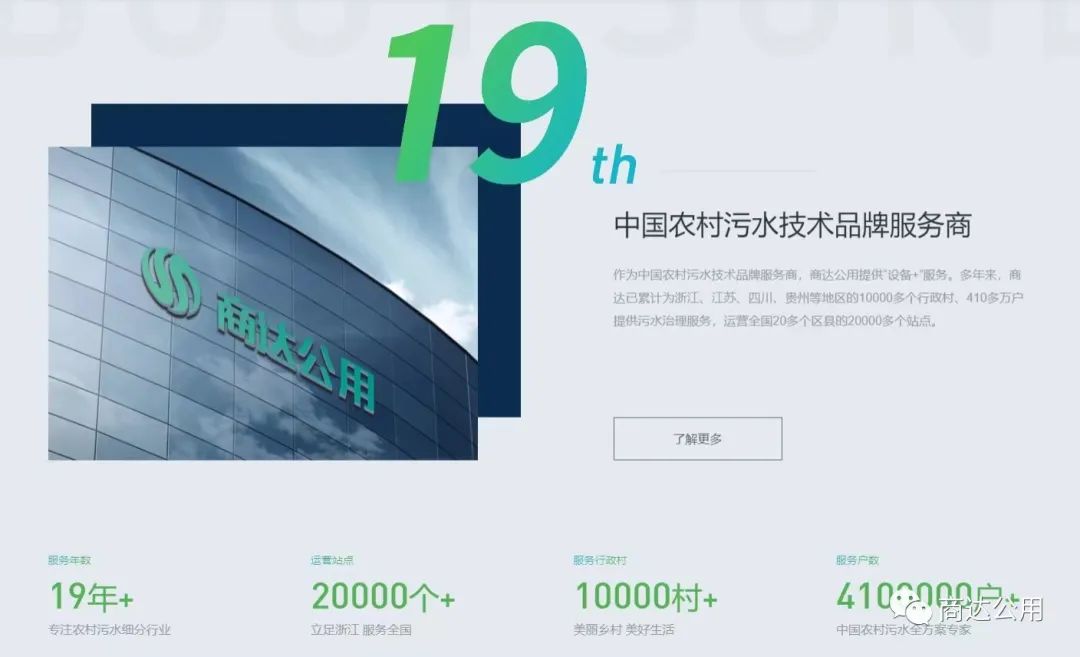 商達(dá)公用成立于2000年,深耕于農(nóng)村污水細(xì)分行業(yè)19年。作為中國(guó)農(nóng)村污水技術(shù)品牌服務(wù)商,商達(dá)公用提供 “設(shè)備+全方案”服務(wù)。19年來(lái),已累計(jì)為全國(guó)410萬(wàn)戶1200萬(wàn)人提供污水治理服務(wù),運(yùn)營(yíng)全國(guó)20個(gè)區(qū)縣的20000個(gè)站點(diǎn)。作為國(guó)家高新技術(shù)企業(yè),商達(dá)公用自2000年成立以來(lái),榮獲省市各項(xiàng)榮譽(yù)。2019年。在E2O的村鎮(zhèn)污水處理年度盤(pán)點(diǎn)中,商達(dá)公用農(nóng)村污水處理總規(guī)模、設(shè)備供應(yīng)總規(guī)模處于全國(guó)第一。2020年,商達(dá)公用被浙江省人民政府辦公廳評(píng)為 “隱形冠軍”培育企業(yè),2021年,商達(dá)公用被浙江省人民政府辦公廳評(píng)為 “專精特新”企業(yè)。
