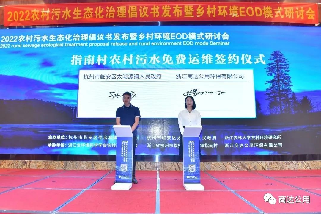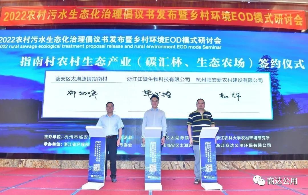 20226月,2022農(nóng)村污水生態(tài)化治理倡議書發(fā)布暨鄉(xiāng)村環(huán)境EOD模式研討會在臨安舉行。會議圍繞農(nóng)村污水生態(tài)化治理為主旨,更好地推動農(nóng)村污水生態(tài)化治理。會議上舉行了臨安指南村農(nóng)村污水免費運維以及生態(tài)產(chǎn)業(yè)(碳匯林、生態(tài)農(nóng)場)開發(fā)簽約儀式。