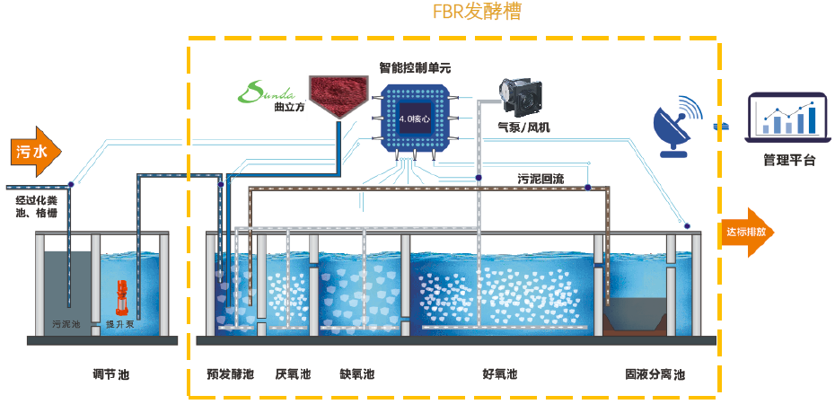 FBR發(fā)酵槽是EEM菌技術(shù)應(yīng)用的核心設(shè)備。一直以來(lái),針對(duì)農(nóng)村污水的處理技術(shù)缺乏對(duì)處理系統(tǒng)核心的認(rèn)識(shí),各種生物處理工藝對(duì)起主導(dǎo)功能作用的微生物認(rèn)識(shí)不足,應(yīng)用方式仍處于比較低端的自然發(fā)生狀態(tài)(如控制溶氧、回流、外加碳源等),特別是當(dāng)前一些商業(yè)化菌劑或菌液產(chǎn)品普遍采用直接投加,但這種簡(jiǎn)單接入方式容易導(dǎo)致功能微生物快速流失、周期短、抗沖擊能力差且應(yīng)用成本較高,極大限制了微生物處理效率,難以實(shí)現(xiàn)農(nóng)村污水的低成本處理模式。因此為了解決這一難點(diǎn),商達(dá)技術(shù)性創(chuàng)新首次在農(nóng)村污水處理領(lǐng)域引入了微生物現(xiàn)代發(fā)酵過(guò)程技術(shù)理念,開(kāi)發(fā)了以FAAO預(yù)發(fā)酵工藝技術(shù)為核心的EEM菌技術(shù)專(zhuān)用FBR發(fā)酵槽,EEM菌快速形成優(yōu)勢(shì)菌群,持續(xù)維持EEM菌的高活性、高豐度,顯著增強(qiáng)污水處理系統(tǒng)的生態(tài)穩(wěn)定性和抗沖擊性,為實(shí)現(xiàn)農(nóng)村污水低成本處理邁出了關(guān)鍵一步。