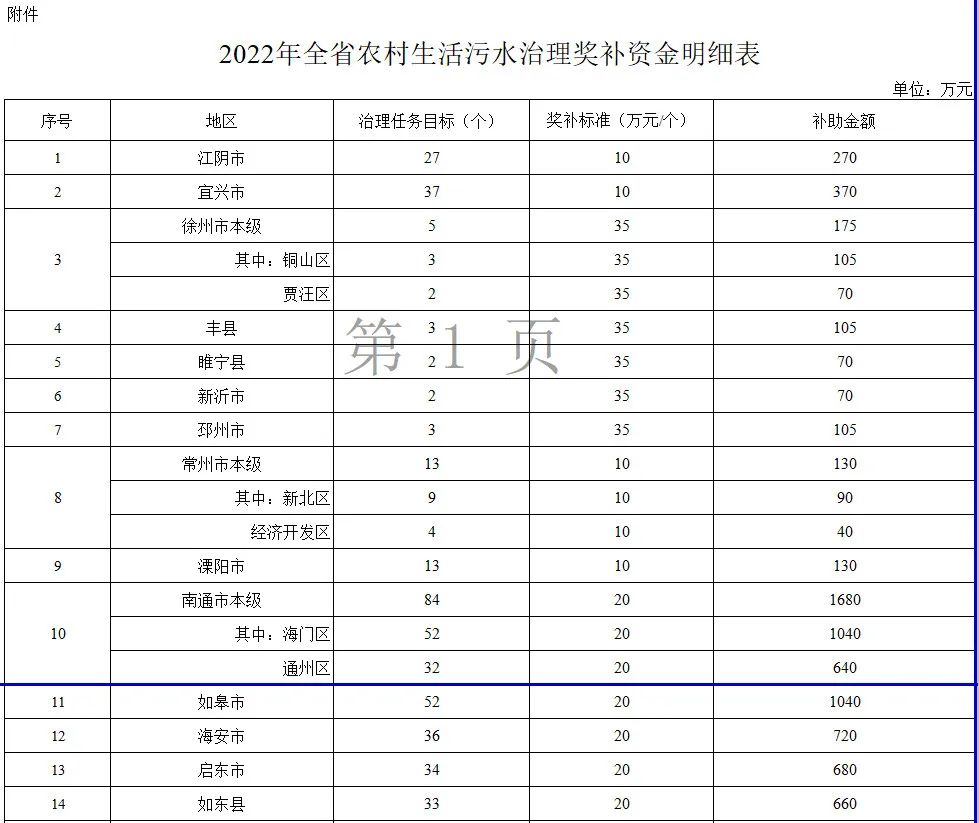 為進(jìn)一步提升我省農(nóng)村生活污水治理水平,確保完成國家和省考核任務(wù),根據(jù)生態(tài)環(huán)境部等5部委《關(guān)于印發(fā)<農(nóng)業(yè)農(nóng)村污染治理攻堅(jiān)戰(zhàn)行動方案(2021-2025)>的通知》(環(huán)土壤〔2022〕8號)和《2022年全省農(nóng)村生活污水治理工作方案》(蘇污防攻堅(jiān)指辦〔2022〕23號),現(xiàn)將2022年江蘇省農(nóng)村生活污水治理獎(jiǎng)補(bǔ)資金下達(dá)給你們,此項(xiàng)資金支出列入2022年政府性基金預(yù)算支出科目“2120816農(nóng)業(yè)農(nóng)村生態(tài)環(huán)境支出”,詳見附件。有關(guān)事項(xiàng)和要求通知如下: