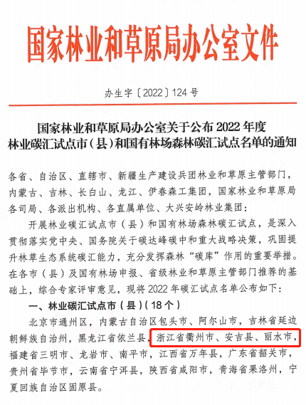 近日,國(guó)家林業(yè)和草原局辦公室公布了2022年度林業(yè)碳匯試點(diǎn)市(縣)名單。經(jīng)各市(縣)及國(guó)有林場(chǎng)申報(bào)、省級(jí)林草主管部門推薦,全國(guó)共18個(gè)市(縣)和21個(gè)國(guó)有林場(chǎng)入選。浙江省衢州市、安吉縣、麗水市成功入選林業(yè)碳匯試點(diǎn)市(縣)建設(shè)名單。