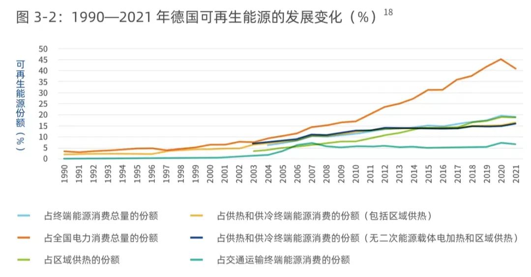 德國是全球能源轉(zhuǎn)型的先驅(qū)之一,也是能源結(jié)構(gòu)較好的國家。2021年,德國可再生能源占終端能源消費(fèi)總量的19.2%,占終端電力消費(fèi)總量的41.1%(2021年是"小風(fēng)年"),占區(qū)域供熱的18.8%,占供熱和供冷的16.5%(包括區(qū)域供熱),占終端交通運(yùn)輸消費(fèi)總量的6.8%。德國的目標(biāo)是:在2030年之前實(shí)現(xiàn)可再生能源供給滿足80%的電力需求和50%的熱力需求。