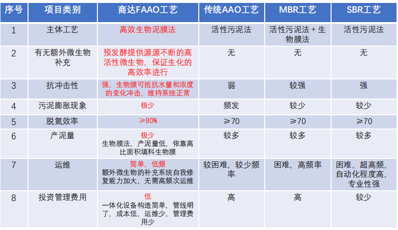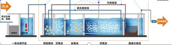 1.0—工程化:工程思維。第一代主要是實現(xiàn)污水治理功能。工藝 集成度高,但施工周期長,隱蔽工程多, 現(xiàn)場質(zhì)量難以保障,內(nèi)部填料需要定期 更換,加大了運維難工作量。 2.0—產(chǎn)品化:產(chǎn)品思維。商達開展農(nóng)村污水處置終端的產(chǎn)品化在 業(yè)界是比較早的。在2008年開始針對 土建施工復(fù)雜等問題進行了成套化、設(shè) 備化改造。產(chǎn)品多以玻璃鋼為材料,采 用半手工纏繞。 3.0—工業(yè)化:工業(yè)思維。這一代產(chǎn)品進行工業(yè)化改造。包括標(biāo) 準化、規(guī)?;?、低成本等。因此,第 三代產(chǎn)品生產(chǎn)方式由手工改為模壓工 廠標(biāo)準化生產(chǎn),質(zhì)量更可靠。 4.0—發(fā)酵強化:效果思維。商達第四代設(shè)備就是在闡明環(huán)境功能微生物代謝特征基礎(chǔ)上,重新認識微生物發(fā)酵過程,通過精細調(diào)控,強化微生物在農(nóng)村污水處 理工藝中的效率。 5.0—生態(tài)化:低碳思維。這一代設(shè)備目前還處于研發(fā)示范階段,我們已經(jīng)在浙江臨安指南村等項目上進行示范展示。其特點是,站在碳中和與鄉(xiāng)村振興的維 度來考慮農(nóng)村污水治理,而不單以治污水一個角度,治理過程中和農(nóng)村生態(tài)、生產(chǎn)、生活相融合,具備資源化利用的功能。 6.0—智慧化 (構(gòu)想):“元宇宙” 思維。這一代設(shè)備擬倚仗強大的終端和后臺支持,解決的不僅僅只是污水智能控制,還包括農(nóng)村環(huán)境監(jiān)測、智慧農(nóng)業(yè)、閉環(huán)循環(huán)利用等多個方面,將技術(shù)體系、運營體系和產(chǎn)業(yè)系統(tǒng)有機融合,更好地服務(wù)未來的美麗鄉(xiāng)村建設(shè)。FBR發(fā)酵槽有兩個顯著的特征,首先在上一代的基礎(chǔ)上進行發(fā)酵強化改進,第二就是產(chǎn)品標(biāo)準多樣性,可以根據(jù)客戶的要求,進行有針 對性地設(shè)計,以滿足不同省份出水標(biāo)準的要求。其中,強化型FRB發(fā)酵槽的出水水質(zhì)可達到地表準Ⅳ類水標(biāo)準。FBR發(fā)酵槽采用FAAO發(fā)酵強化工藝,在提高建設(shè)速度的同時可以保證出水穩(wěn)定達標(biāo)。其中F表示:發(fā) 酵 Fermentation;B表示:生物膜 Biofilm R表示:反應(yīng)器 Reactor,F(xiàn)AAO發(fā)酵強化工藝是一種基于厭氧/ 缺氧/好氧(AAO)生化組合,利用發(fā)酵技術(shù),強化脫氮除磷功能的移動床生物膜工藝。