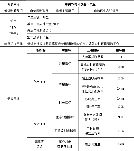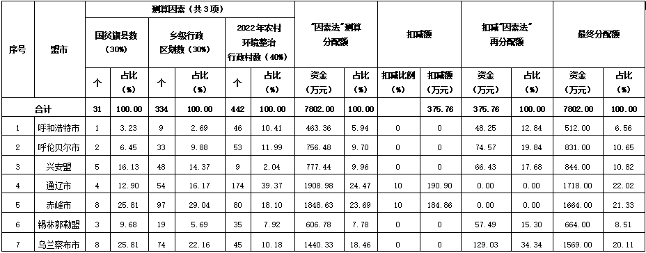 內(nèi)蒙古自治區(qū)財政廳達(dá)2022年中央農(nóng)村環(huán)境整治資金,共計7802萬元,用于農(nóng)村生活污水處理等領(lǐng)域。詳情如下:內(nèi)蒙古自治區(qū)財政廳關(guān)于下達(dá)2022年中央農(nóng)村環(huán)境整治資金的通知各有關(guān)盟市財政局:根據(jù)《財政部關(guān)于下達(dá)2022年農(nóng)村環(huán)境整治資金預(yù)算的通知》(財資環(huán)〔2022〕156號)和《自治區(qū)生態(tài)環(huán)境廳關(guān)于2022年中央農(nóng)村環(huán)境整治資金分配建議的函》(內(nèi)環(huán)函〔2023〕39號),現(xiàn)下達(dá)2022年中央農(nóng)村環(huán)境整治資金7802萬元,并就有關(guān)事項通知如下:一、資金下達(dá)具體地區(qū)及分配金額詳見附件1,項目代碼:10000017Z175060020003,支出列2022年政府收支分類科目:2110402-節(jié)能環(huán)保支出-農(nóng)村環(huán)境保護(hù)。二、請相關(guān)盟市按照《財政部關(guān)于印發(fā)<農(nóng)村環(huán)境整治資金管理辦法>的通知》(財資環(huán)〔2021〕43號)等有關(guān)要求,加強資金管理,加快預(yù)算執(zhí)行,切實提升財政資金使用效益。三、根據(jù)《內(nèi)蒙古自治區(qū)農(nóng)村環(huán)境整治資金管理辦法》中“農(nóng)村牧區(qū)環(huán)境綜合整治任務(wù)量、鄉(xiāng)級行政區(qū)劃數(shù)量、項目儲備情況等因素,分配權(quán)重分別為40%、30%、30%”,結(jié)合財政部等11部門《關(guān)于繼續(xù)支持脫貧縣統(tǒng)籌整合使用財政涉農(nóng)資金工作的通知》(財農(nóng)〔2021〕22號)要求,將“項目儲備情況”因素替換為“國貧旗縣數(shù)”。結(jié)合資金分配原則和我區(qū)實際,采用國家扶貧開發(fā)重點旗縣個數(shù)(權(quán)重為30%)、鄉(xiāng)級行政區(qū)劃數(shù)(權(quán)重為30%)、2022年已完成農(nóng)村環(huán)境整治行政村個數(shù)(權(quán)重為40%)3項因素進(jìn)行測算。盟市資金分配額=分配資金額×(該盟市國家級扶貧開發(fā)重點旗縣個數(shù)/自治區(qū)國家級扶貧開發(fā)重點旗縣總數(shù)×0.3+該盟市國家級扶貧開發(fā)重點旗縣所屬鄉(xiāng)級行政區(qū)劃數(shù)/自治區(qū)國家級扶貧開發(fā)重點旗縣鄉(xiāng)級行政區(qū)劃總數(shù)×0.3+該盟市2022年度完成農(nóng)村環(huán)境整治行政村數(shù)/自治區(qū)有國家級扶貧開發(fā)重點旗縣的盟市2022年完成農(nóng)村環(huán)境整治行政村總數(shù)×0.4)。四、資金扣減。本次資金分配對2021年污染防治攻堅戰(zhàn)考核中生態(tài)環(huán)保資金使用績效排名后三位盟市扣減2022年中央專項資金預(yù)算應(yīng)分配額度的10%,本次涉及資金扣減盟市為通遼市、赤峰市。五、資金重點用于已納入中央農(nóng)村環(huán)境整治項目儲備庫的項目。請相關(guān)盟市加強項目管理,強化項目全過程監(jiān)管和實施情況調(diào)度,確保資金??顚S?,切實提高項目進(jìn)度和預(yù)算執(zhí)行率。落實生態(tài)環(huán)保項目儲備制度有關(guān)要求,按照“資金跟著項目走”的原則,做好項目儲備工作,盡快形成有效投資,避免“資金等項目”。對已從中央基建投資等其他渠道獲得中央財政資金支持的項目,不得納入資金支持范圍。請有關(guān)盟市采取有效措施,增強預(yù)算執(zhí)行力,嚴(yán)禁擠占、截留、挪用。資金使用撥付執(zhí)行國庫集中支付和政府采購制度。六、請有關(guān)盟市按照《中共中央國務(wù)院關(guān)于全面實施預(yù)算績效管理的意見》的要求,科學(xué)設(shè)定績效目標(biāo),做好績效監(jiān)控和績效評價,確保財政資金安全有效。同時,請參照自治區(qū)做法,將你盟市績效目標(biāo)及時對下分解,做好預(yù)算績效管理工作。請將2022年中央農(nóng)村環(huán)境整治資金分配、使用情況及《農(nóng)村環(huán)境整治資金區(qū)域績效目標(biāo)申報表》(附件2)和分解下達(dá)績效目標(biāo)于收文30日內(nèi)報自治區(qū)財政廳和生態(tài)環(huán)境廳備案,同時抄送財政部內(nèi)蒙古監(jiān)管局。附件1 2022年中央農(nóng)村環(huán)境整治專項資金分配情況表附件2 2022年中央農(nóng)村環(huán)境整治資金區(qū)域績效目標(biāo)表