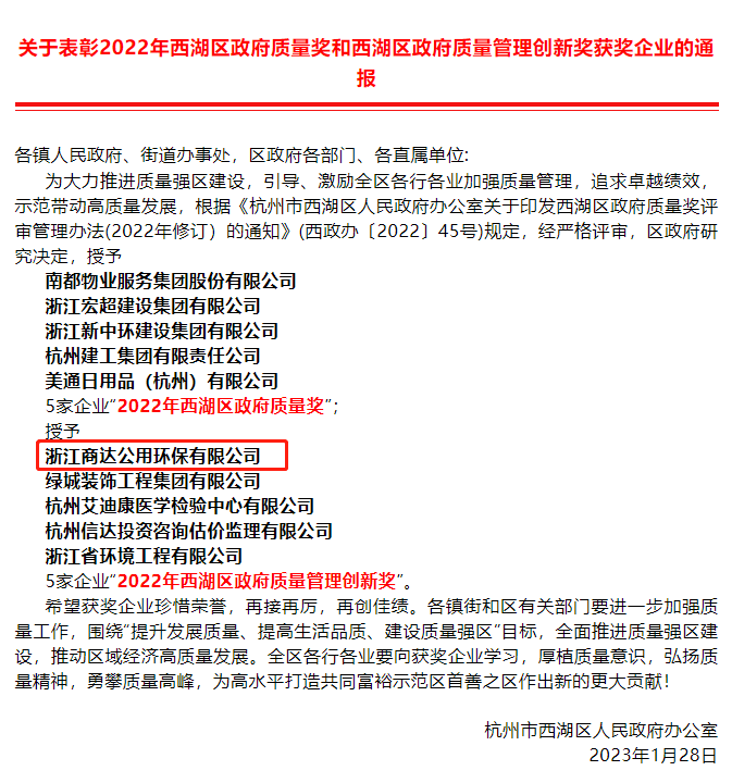 近日,杭州市西湖區(qū)人民政府發(fā)布“關于表彰2022年西湖區(qū)政府質(zhì)量獎和西湖區(qū)政府質(zhì)量管理創(chuàng)新獎獲獎企業(yè)”的通報,商達公用榮獲“2022年西湖區(qū)政府質(zhì)量管理創(chuàng)新獎”。