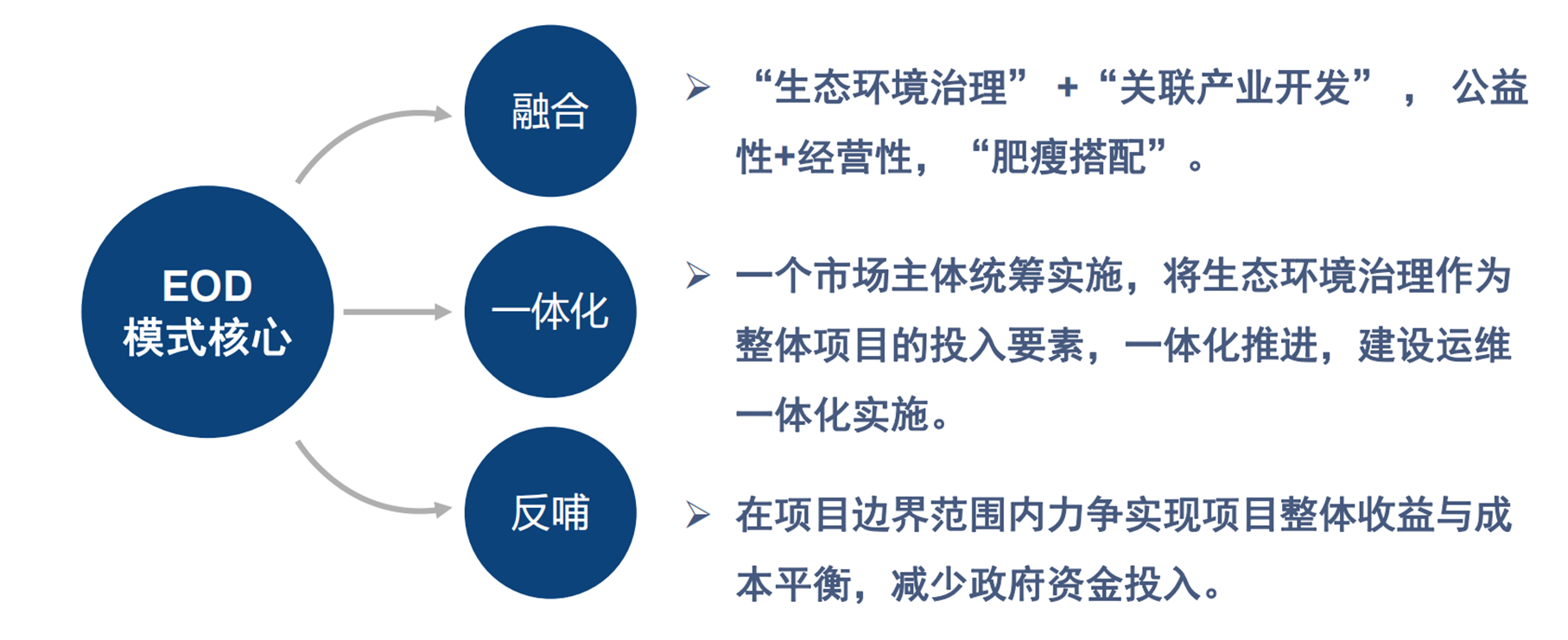 生態(tài)環(huán)境導(dǎo)向的開(kāi)發(fā)模式(簡(jiǎn)稱(chēng)EOD模式)是以生態(tài)文明建設(shè)為引領(lǐng),以可持續(xù)發(fā)展為目標(biāo),以生態(tài)保護(hù)和環(huán)境治理為基礎(chǔ),以特色產(chǎn)業(yè)運(yùn)營(yíng)為支撐,以區(qū)域綜合開(kāi)發(fā)為載體,采取產(chǎn)業(yè)鏈延伸、聯(lián)合經(jīng)營(yíng)、組合開(kāi)發(fā)等方式,推動(dòng)公益性較強(qiáng)、收益性差的生態(tài)環(huán)境治理項(xiàng)目與收益較好的關(guān)聯(lián)產(chǎn)業(yè)有效融合,統(tǒng)籌推進(jìn),一體化實(shí)施,將生態(tài)環(huán)境治理帶來(lái)的經(jīng)濟(jì)價(jià)值內(nèi)部化,創(chuàng)新性的項(xiàng)目組織實(shí)施方式。