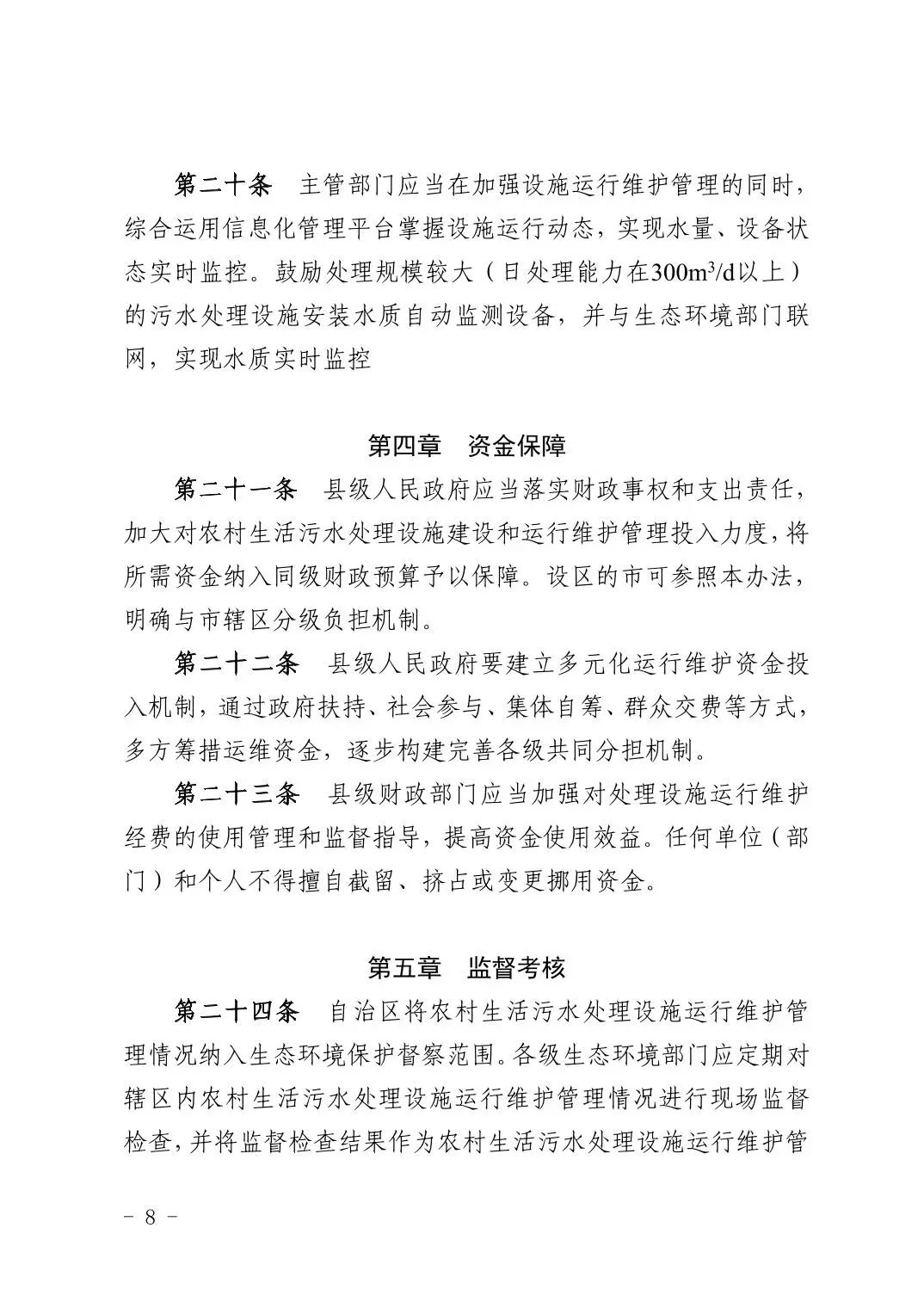 在資金運維上,《辦法》規(guī)定由自治區(qū)財政廳負責(zé)指導(dǎo)市、縣(區(qū))財政部門建立健全農(nóng)村生活污水處理設(shè)施建設(shè)或改造、運維管理經(jīng)費保障機制;縣級人民政府應(yīng)當(dāng)加大對農(nóng)村生活污水處理設(shè)施建設(shè)和運行維護管理投入力度,將所需資金納入同級財政預(yù)算予以保障,建立多元化運行維護資金投入機制,通過政府扶持、社會參與、集體自籌、群眾交費等方式,多方籌措運維資金,逐步構(gòu)建完善各級共同分擔(dān)機制,任何單位(部門)和個人不得擅自截留、擠占或變更挪用資金。
