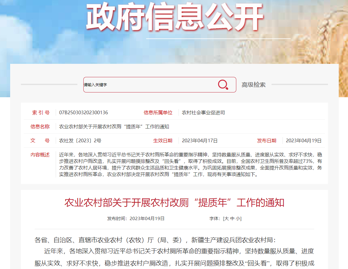 各省、自治區(qū)、直轄市農(nóng)業(yè)農(nóng)村(農(nóng)牧)廳(局、委),新疆生產(chǎn)建設(shè)兵團(tuán)農(nóng)業(yè)農(nóng)村局:近年來(lái),各地深入貫徹習(xí)近平總書(shū)記關(guān)于農(nóng)村廁所革命的重要指示精神,堅(jiān)持?jǐn)?shù)量服從質(zhì)量、進(jìn)度服從實(shí)效、求好不求快,穩(wěn)步推進(jìn)農(nóng)村戶廁改造,扎實(shí)開(kāi)展問(wèn)題摸排整改及“回頭看”,取得了積極成效。目前,全國(guó)農(nóng)村衛(wèi)生廁所普及率超過(guò)73%,有力改善了農(nóng)村人居環(huán)境,提升了農(nóng)民群眾生活品質(zhì)和衛(wèi)生健康水平。為鞏固拓展摸排整改成果,全面提升改廁質(zhì)量和實(shí)效,務(wù)實(shí)推進(jìn)農(nóng)村廁所革命,農(nóng)業(yè)農(nóng)村部決定開(kāi)展農(nóng)村改廁“提質(zhì)年”工作,現(xiàn)將有關(guān)事項(xiàng)通知如下。通過(guò)開(kāi)展農(nóng)村改廁“提質(zhì)年”工作,聚焦重點(diǎn)問(wèn)題、緊盯薄弱環(huán)節(jié)、強(qiáng)化規(guī)范管理,推動(dòng)工作機(jī)制不斷完善和工作作風(fēng)進(jìn)一步改進(jìn),推進(jìn)問(wèn)題廁所扎實(shí)整改、新建廁所質(zhì)量過(guò)硬、長(zhǎng)效管護(hù)機(jī)制建立健全、財(cái)政資金使用安全有效、農(nóng)民群眾參與度滿意度明顯提高,切實(shí)提高農(nóng)村改廁工作質(zhì)量。