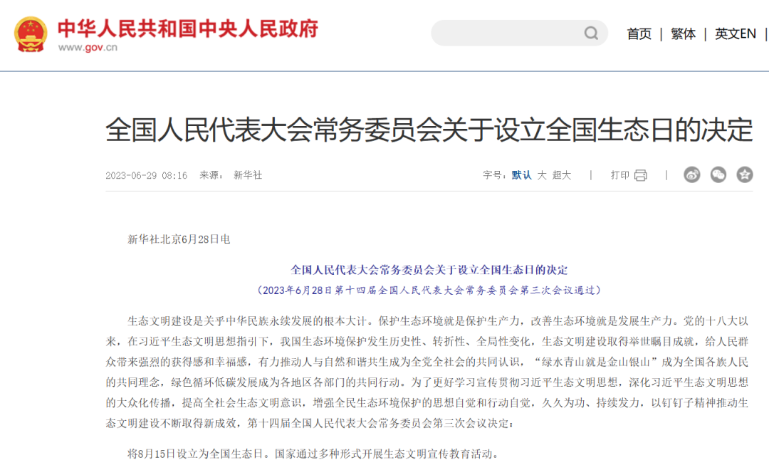 2023年8月15日,是我國(guó)首個(gè)全國(guó)生態(tài)日。這一天,也是習(xí)近平總書記在浙江安吉考察時(shí)首次提出“綠水青山就是金山銀山”的科學(xué)論斷的紀(jì)念日。這一論斷是習(xí)近平生態(tài)文明思想的核心理念,也是指導(dǎo)中國(guó)生態(tài)文明建設(shè)的重要原則。全國(guó)生態(tài)日的由來(lái)全國(guó)生態(tài)日的設(shè)立是由浙江省人大代表團(tuán)提出的議案,經(jīng)過(guò)全國(guó)人大常委會(huì)審議通過(guò)。這是我國(guó)第一個(gè)以決定形式設(shè)立的綜合性活動(dòng)日,也是我國(guó)第一個(gè)以“全國(guó)”命名的活動(dòng)日。將8月15日設(shè)立為全國(guó)生態(tài)日,比較符合確定紀(jì)念日、活動(dòng)日時(shí)間的基本原則,能夠充分體現(xiàn)首創(chuàng)性、標(biāo)志性、獨(dú)特性。8月15日正是習(xí)近平總書記在浙江工作期間,2005年考察湖州市安吉縣時(shí)首次提出“綠水青山就是金山銀山”的科學(xué)論斷。這一論斷是習(xí)近平生態(tài)文明思想的核心理念。習(xí)近平總書記曾多次強(qiáng)調(diào),“綠水青山就是金山銀山”不僅是一種理念,更是一種行動(dòng)。全國(guó)生態(tài)日的目的全國(guó)生態(tài)日的主要目的是更好地學(xué)習(xí)宣傳貫徹習(xí)近平生態(tài)文明思想,深化習(xí)近平生態(tài)文明思想的大眾化傳播,提高全社會(huì)生態(tài)文明意識(shí),增強(qiáng)全民生態(tài)環(huán)境保護(hù)的思想自覺(jué)和行動(dòng)自覺(jué),久久為功、持續(xù)發(fā)力,以釘釘子精神推動(dòng)生態(tài)文明建設(shè)不斷取得新成效。習(xí)近平總書記指出,“建設(shè)美麗中國(guó)、實(shí)現(xiàn)中華民族偉大復(fù)興,需要我們一代代人接力奮斗”。 全國(guó)生態(tài)日的設(shè)立,有利于激發(fā)全社會(huì)對(duì)美麗中國(guó)建設(shè)的責(zé)任感和使命感,引導(dǎo)廣大人民群眾積極參與到生態(tài)文明建設(shè)中來(lái),形成人與自然和諧共生、共同發(fā)展、共享未來(lái)的良好局面。全國(guó)生態(tài)日的內(nèi)容全國(guó)生態(tài)日的主要內(nèi)容是通過(guò)多種形式開(kāi)展生態(tài)文明宣傳教育活動(dòng),包括舉辦主題宣傳活動(dòng)、開(kāi)展環(huán)境保護(hù)志愿服務(wù)、組織生態(tài)文明知識(shí)競(jìng)賽、展示生態(tài)文明建設(shè)成果、推廣綠色低碳生活方式等。全國(guó)生態(tài)日的首次實(shí)施將于2023年8月15日開(kāi)始,屆時(shí)將有一系列相關(guān)活動(dòng)舉行。首個(gè)全國(guó)生態(tài)日,國(guó)家發(fā)展改革委將會(huì)同中央宣傳部、自然資源部、生態(tài)環(huán)境部等部門和浙江省人民政府在浙江省湖州市舉辦首個(gè)全國(guó)生態(tài)日主場(chǎng)活動(dòng)。此外,還將有各地區(qū)各部門各單位根據(jù)實(shí)際情況,開(kāi)展各具特色的生態(tài)文明宣傳教育活動(dòng),讓全國(guó)生態(tài)日成為一場(chǎng)全民參與、共同學(xué)習(xí)、共同行動(dòng)的生態(tài)文明盛會(huì)。全國(guó)生態(tài)日標(biāo)識(shí)(全國(guó)生態(tài)日標(biāo)識(shí),來(lái)源:國(guó)家發(fā)改委)