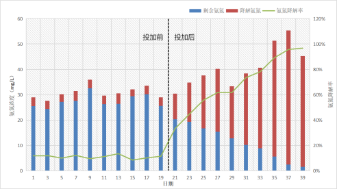 根據(jù)在山東濟寧進行的原位對比試驗,在投加低溫功能菌之前,由于收到低溫的影響氨氮和總氮去除率僅在8-20%之間徘徊;而在投加低溫功能菌之后,總氮去除率在20天后就躍升至70%,而氨氮的去除率更是攀升至90%左右,出水達到一級A標(biāo)準(zhǔn)。該成果的取得極大地增強了公司在北方農(nóng)污市場的核心競爭力,同時為確?,F(xiàn)有工程的順利實施提供了技術(shù)保障。該成果已于2023年8月21日順利通過專家鑒定。