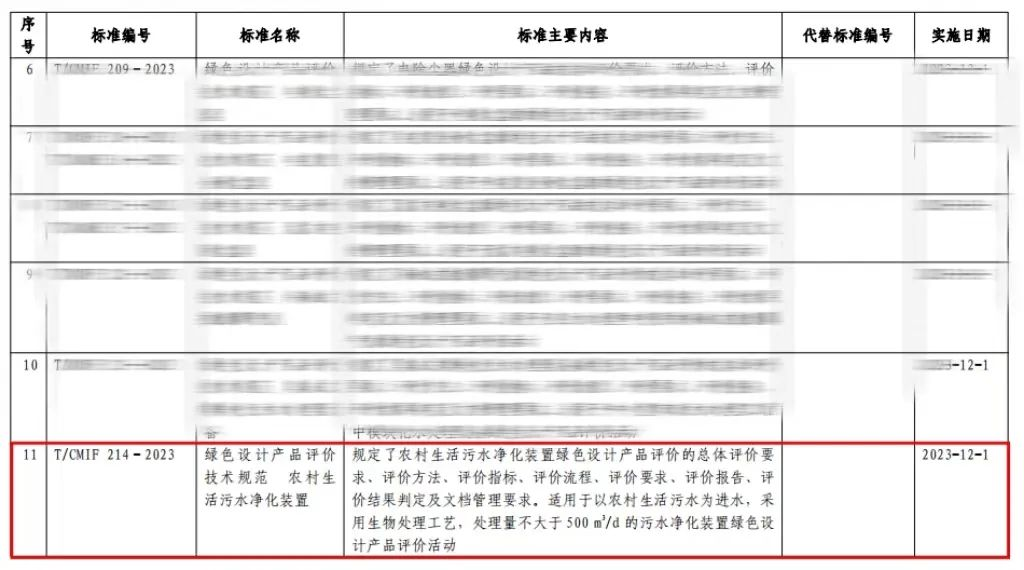 2023年10月10日,中國機械工業(yè)聯(lián)合會發(fā)布2023年第4號公告,批準(zhǔn)17項中國機械工業(yè)聯(lián)合會團(tuán)體標(biāo)準(zhǔn)。由商達(dá)公用起草主編的T/CMIF 214-2023《綠色設(shè)計產(chǎn)品評價技術(shù)規(guī)范 農(nóng)村生活污水凈化裝置》名列榜單,自2023年12月1日起實施。