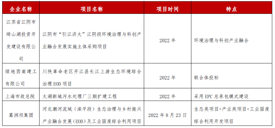 2021年12月江蘇省發(fā)布《推進污水資源化利用的實施方案》,鼓勵采用EOD開發(fā)模式,建設(shè)一批“新概念”污水處理廠、尾水生態(tài)凈化濕地等工程,形成可復制可推廣的利用模式。2019年江蘇省成立戰(zhàn)略性環(huán)保企業(yè)—江蘇省環(huán)保集團,其在2021年12月江蘇省第十四次黨代會提出明確提出:“探索環(huán)境修復+開發(fā)建設(shè)EOD新模式”,成為EOD項目實施主體,打通EOD項目落地的“最后一公里”。