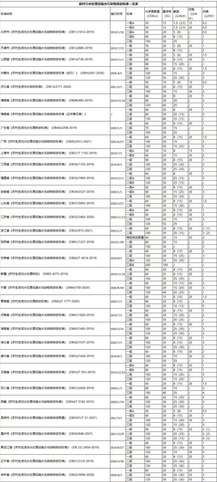 一、全國31省農(nóng)村污水排放標準