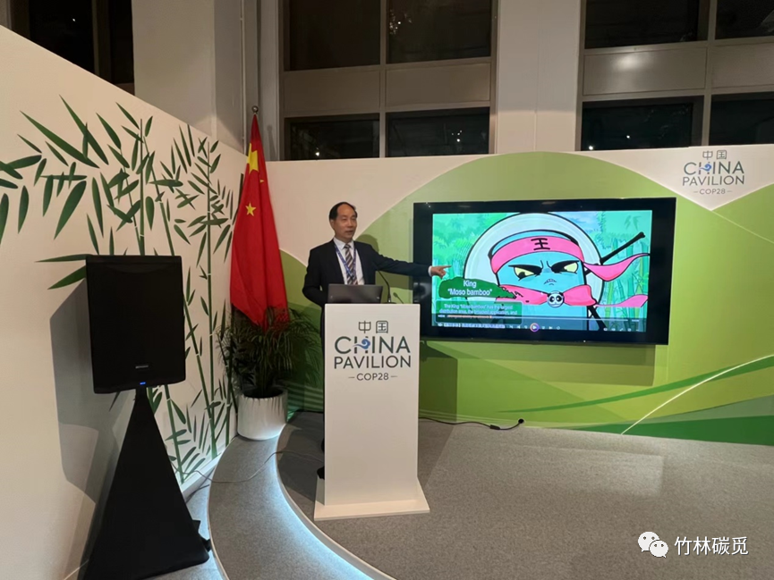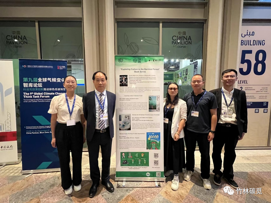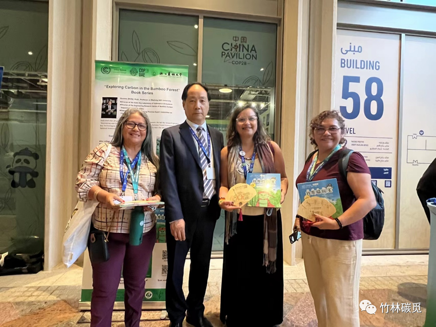 聯合國氣候變化框架公約第28次締約方大會于2023年11月30日在阿聯酋迪拜開幕。作為聯合國氣候變化大會觀察員單位,浙江農林大學的周國模教授帶領團隊成員徐林、李翀、梅婷婷和王麗一行5人赴迪拜參加了COP28。12月6日,團隊《竹林碳覓》系列科普作品亮相中國角,吸引來自世界各地的參會者駐足關注,其中《我是吸碳王》兒童繪本(中英版)受熱捧,共贈送了150余本。此外,《我是吸碳王》短視頻在中國角冷餐會上循環(huán)播放。12月8日,由中國綠色碳匯基金會、加拿大UBC大學和浙江農林大學聯合組織的“林業(yè)基于自然的氣候變化解決方案(NbS):知識與技能的全球對話”在COP28邊會上舉辦,來自國內外的林業(yè)專家、企業(yè)家、政府官員等共同探討了林業(yè)緩解氣候變化的現狀和趨勢。會上,周國模教授團隊成員作了題為“King of Carbon Sequestration: From Professional to Public for Bamboo Forest Carbon”和“Grading for Products Using Bamboo as a Substitute for Plastic based on an Integrated Environmental Effect”的報告,介紹了團隊在竹林碳匯科普和“以竹代塑”產品分級上的相關工作,引起了與會者的廣泛關注和熱烈討論。