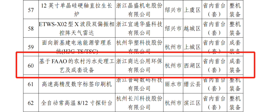 2023年12月31日,浙江省經(jīng)濟和信息化廳公布《2023年度浙江省首臺(套)裝備名單》,確定2023年度浙江省首臺(套)裝備292項,其中國際首臺(套)裝備3項、國內(nèi)首臺(套)裝備53項、省內(nèi)首臺(套)裝備236項。商達公用“基于FAAO的農(nóng)村污水處理工藝成套設(shè)備”成功認定浙江省首臺(套)裝備。