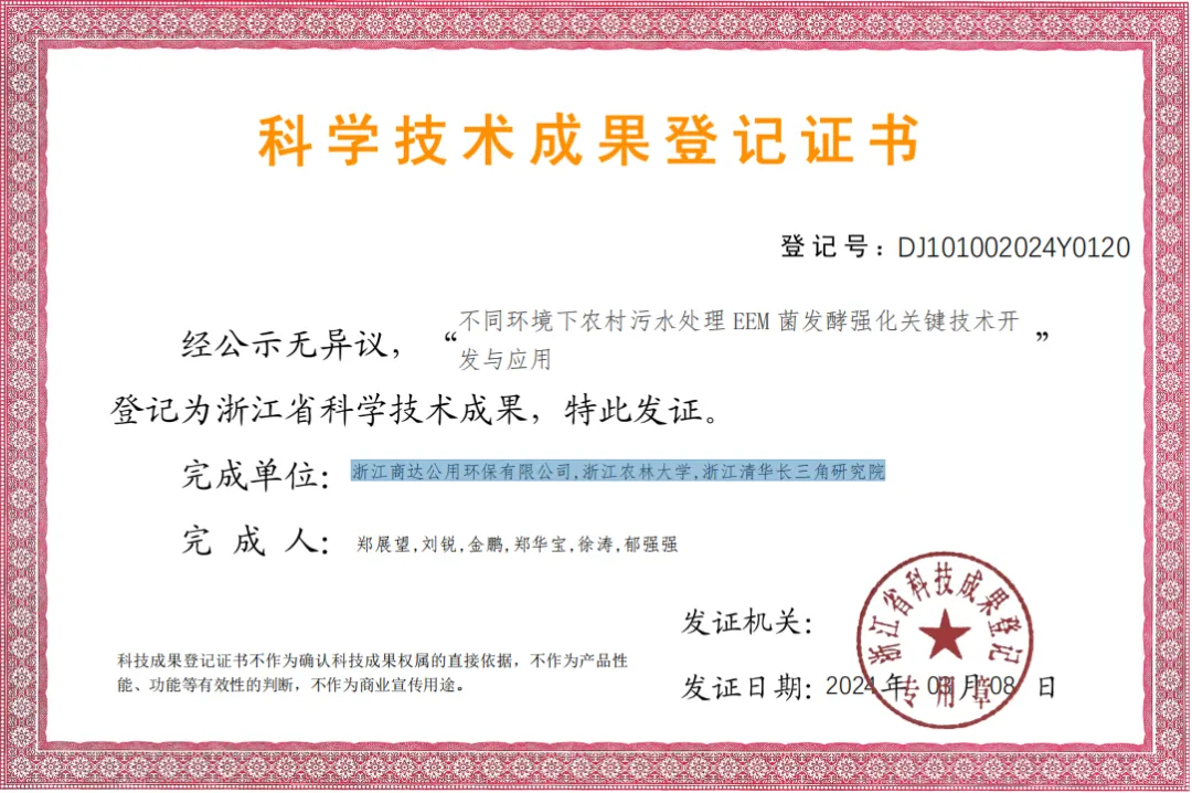 該成果經(jīng)多位中國(guó)工程院院士牽頭組成的專(zhuān)家鑒定委員會(huì)鑒定結(jié)論:“該項(xiàng)目成果創(chuàng)新突出,整體技術(shù)達(dá)到國(guó)際先進(jìn)水平,在針對(duì)不同環(huán)境下農(nóng)村污水處理專(zhuān)用菌種的研發(fā)和篩選技術(shù)處于國(guó)際領(lǐng)先水平。”